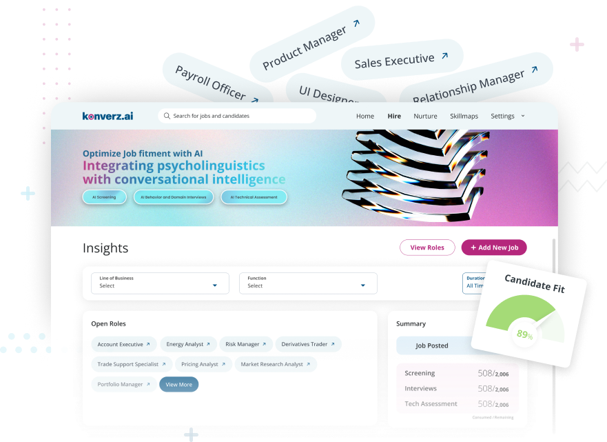 Konverz AI uses behavioral science to evaluate the candidate's personality traits, cognition level, drives, and emotions against industry standards. It maps the candidate's behavioral patterns to the specific role and provides insights on their role-related behaviors and job fit.